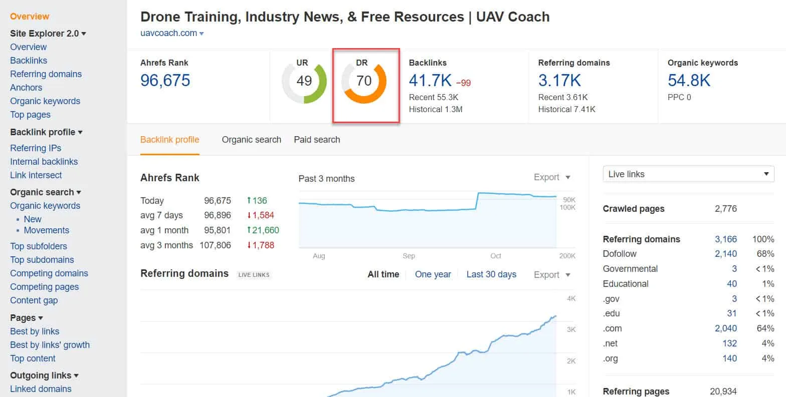 To get an idea of domain authority, you can refer to Ahrefs’ Domain Rating (DR). It measures the authoritativeness of a site based on the number and quality of backlinks. The better the backlinks are, the higher the site’s DR is.
