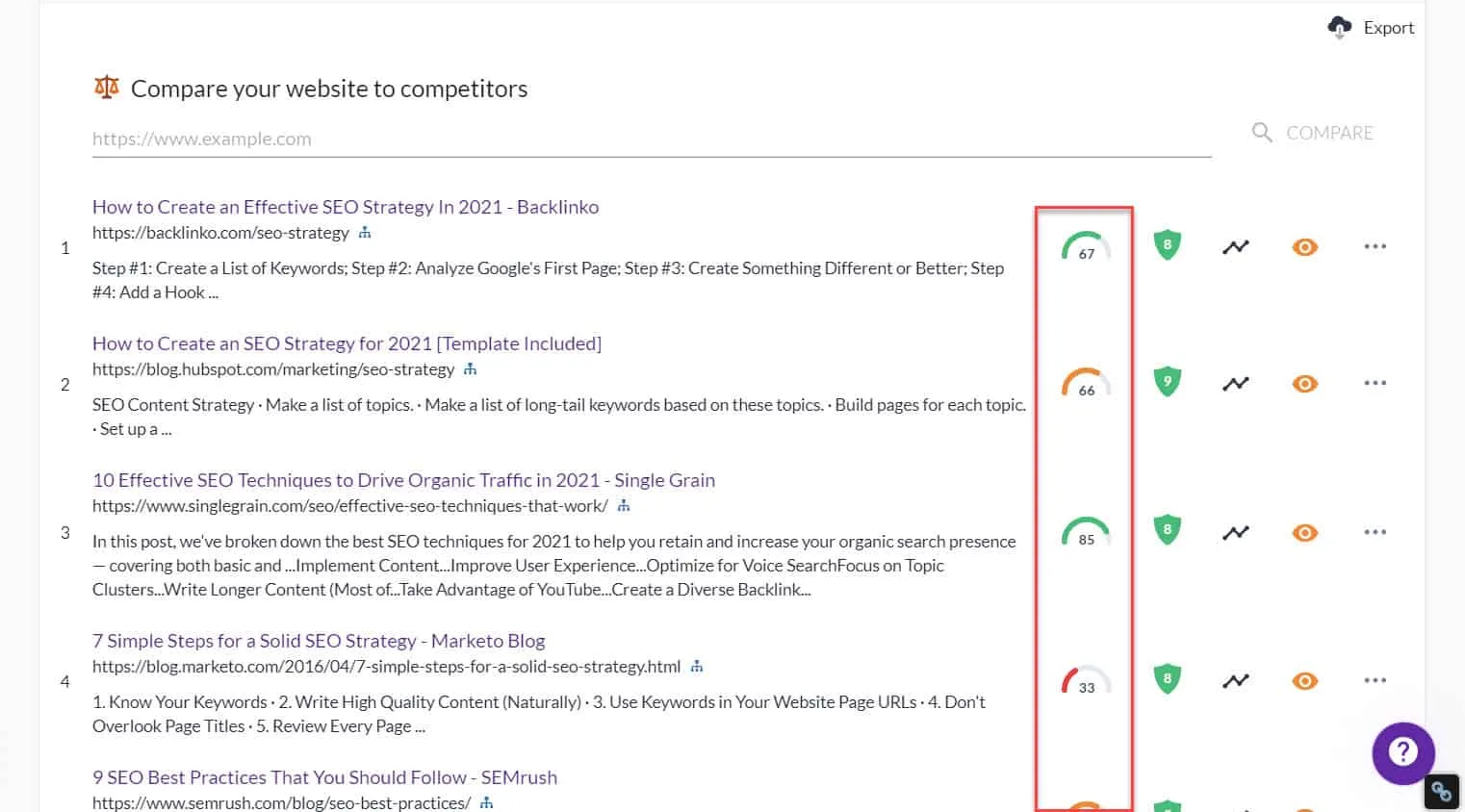 Surfer’s SERP Analyzer shows you the content score of the pages ranking for your chosen keyword.